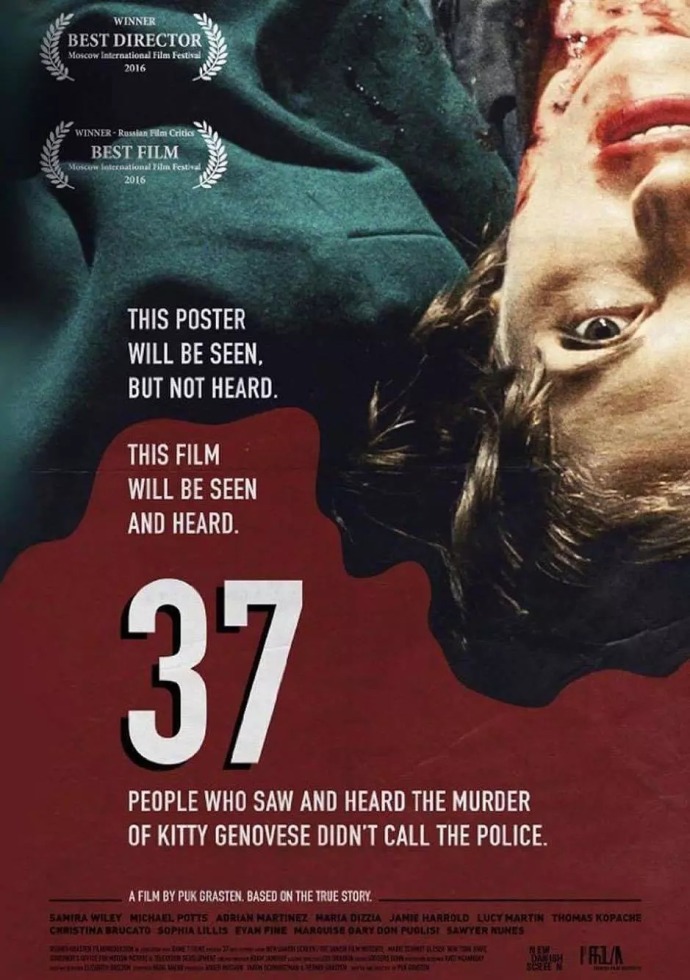 取材于1964年震惊纽约的一桩谋杀案,基蒂·吉诺维斯被残忍地奸杀,她的37个邻居都亲眼目睹了这一过程,但无一人挺身而出或是报警求助。《纽约时报》为此曾撰文直接将矛头指向了那些未伸出援手的目击者。而影片《沉默37人》却展现了一个不同的视角,从这37名目击者所面临的各种问题深刻剖析了他们视若无睹的原因,反映了当代社会问题,发人深省。